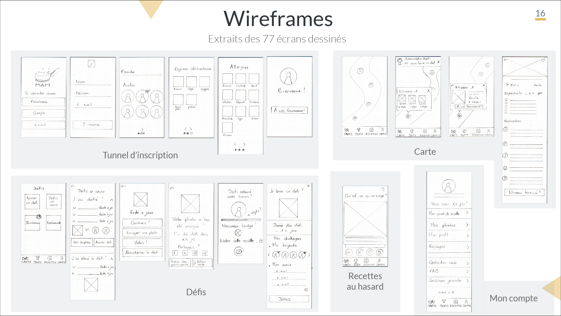 Une fois cette idée précisée et plus complète, je me lance dans un premier jet de conception, un wireframe papier. Cela m’a permis de faire à la fois une arborescence palpable et rapide, ainsi qu’une première maquette, déjà testable. Après quelques heures de travail et de réflexion, chaque écran de mon application étaient étalés sur le papier.