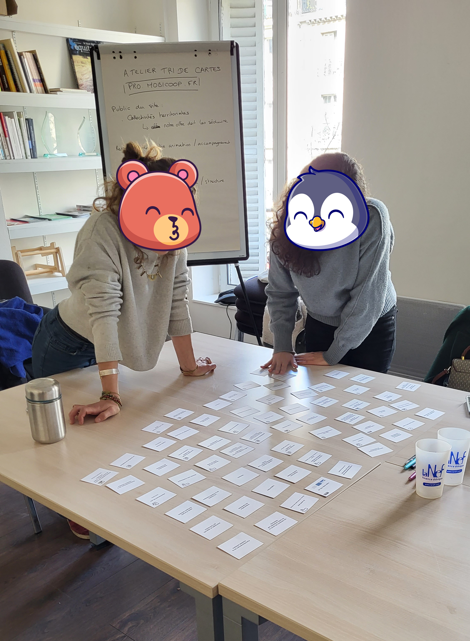 Cet atelier a réunit 4 participants. J’ai proposé aux participants de travailler en équipe de 2. Après leur avoir expliquer l’objectif de l’atelier de l’atelier et le principe de l’exercice, je leur ai laissé 1 heure pour trier les cartes. Pendant ce temps, j’ai navigué entre les groupes afin de les aider en cas de blocage, de rappeler l’objectif lorsque je sentais que les participants se perdaient un peu et surtout j’ai veillé au bon respect du temps.